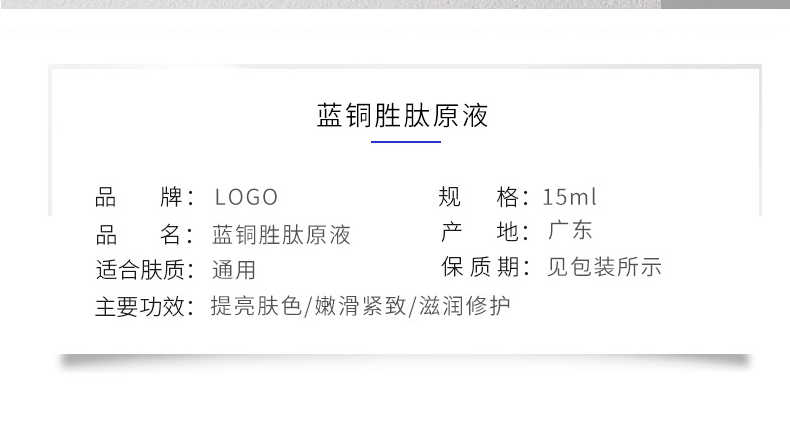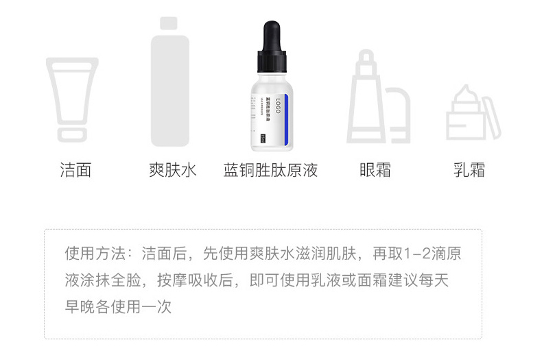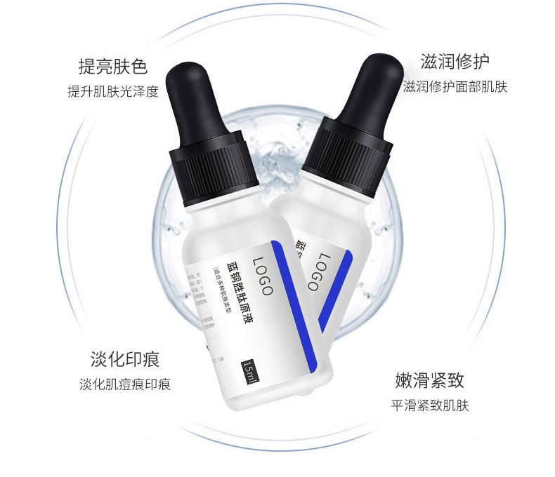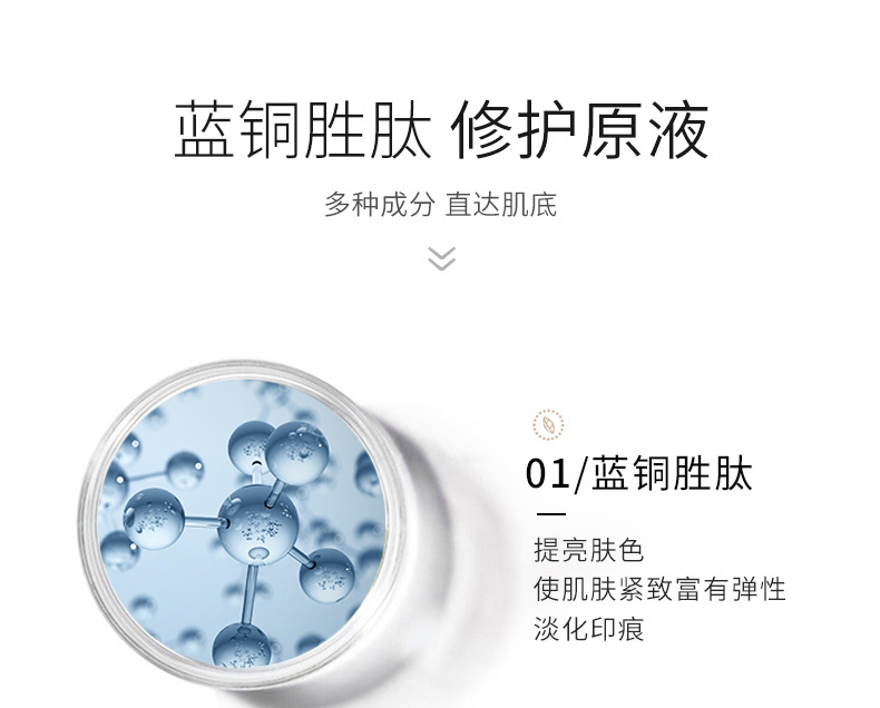 Blue copper peptide liquid can moisturize and repair, make the skin smooth and tender, very good water retention effect, lock the water, so that the water does not lose, so it looks more elastic, so that your skin looks more peeled egg smooth and elastic. He can also repair and protect red skin, especially sensitive skin, you can try blue copper peptide essence, shrink pores, especially easy to absorb, can anti-wrinkle tight skin, really good, while young seize maintenance